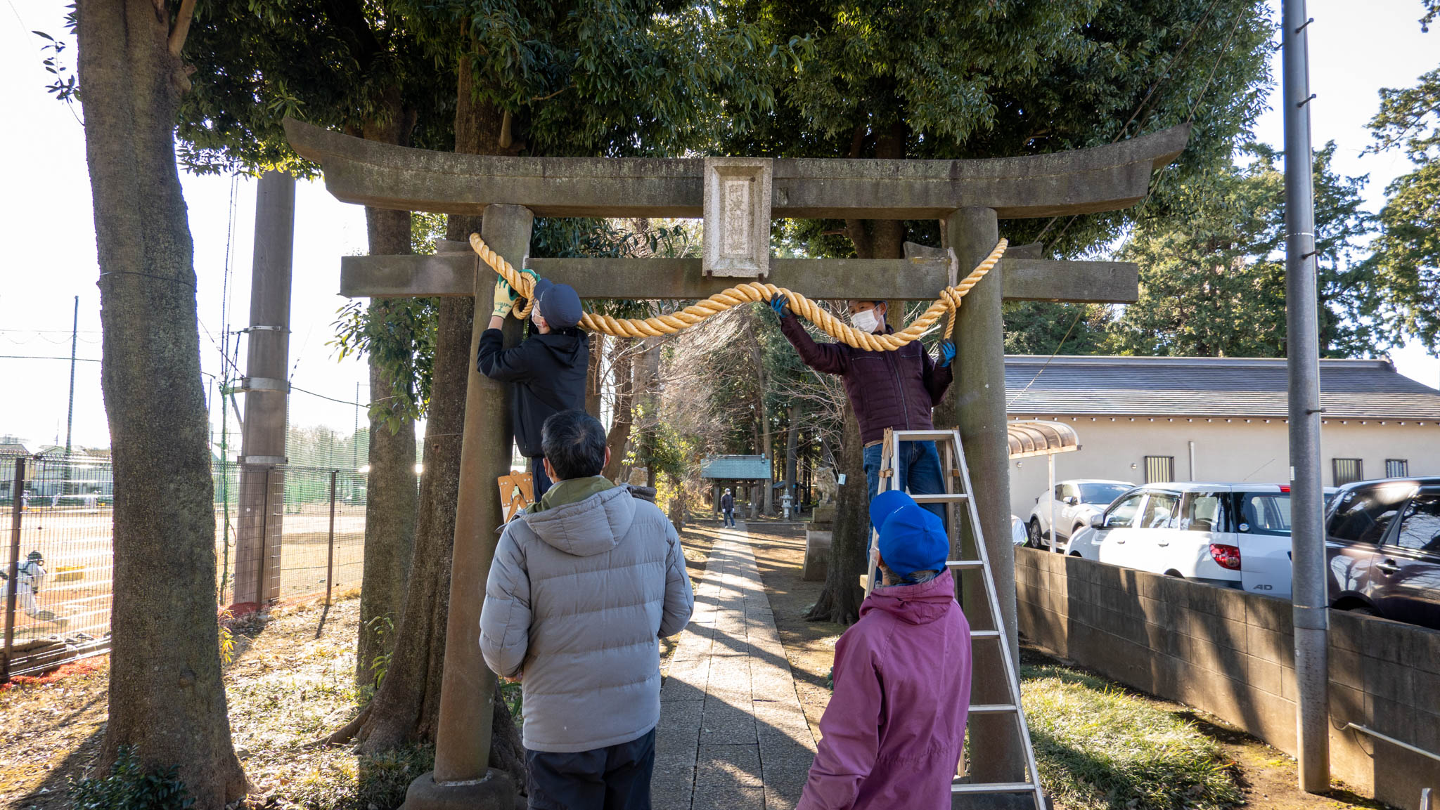 アーチの隣にある原木の柱にも飾り付け。 手前にオークの原木を、年輪が見えるように設置します。 残るは中央の飾り付けです。 真ん中にオークの原木で柱を建てて、一番下のすぐ隣にマツのフェンスを設置。03/28 御神燈飾り付け 古来から祭の初日は子の神まで曳き、一夜を明かした由緒ある「諏訪大社上社御柱御旅所」その前の御柱街道に御神灯の「あんどん」としめ縄が飾り付けられた。 曳行中の御柱が必ず止まり、大社の神職からお清めを受ける大切な場所。